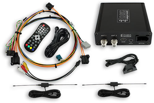 Diversity DVB-T Tuner with USB port and multimedia interface in one casing. The Plug & Play cable kit allows for easy connection to the navigation unit. The Tuner functions are controlled via the navigation buttons. The controls are based on the control scheme of the original TV tuner. Detected stations will be added directly to the station roster of the TV level. The EPG is also displayed in the original TV menu of the navigation system.